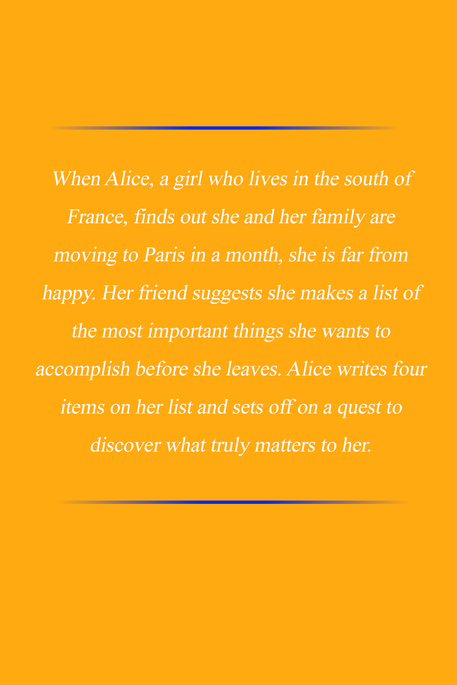 When Alice, a girl who lives in the south of France, finds out she and her family are moving to Paris in a month, she is far from happy. Her friend suggests she makes a list of the most important things she wants to accomplish before she leaves. Alice writes four items on her list and sets off on a quest to discover what truly matters to her.
