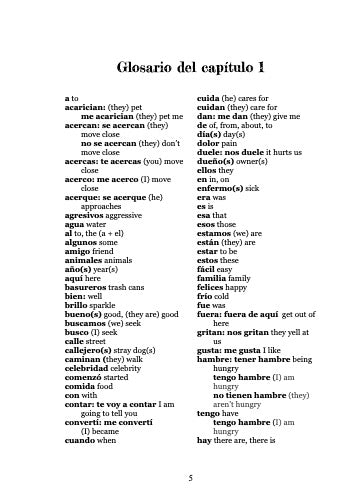 The novella is told mostly in the present tense with a smattering of past tense. With about 330 unique words and plenty of repetition, it tells a 3,620-word story about the bond between a dog and a human. A full glossary for each of the seven chapters is included plus illustrations.
