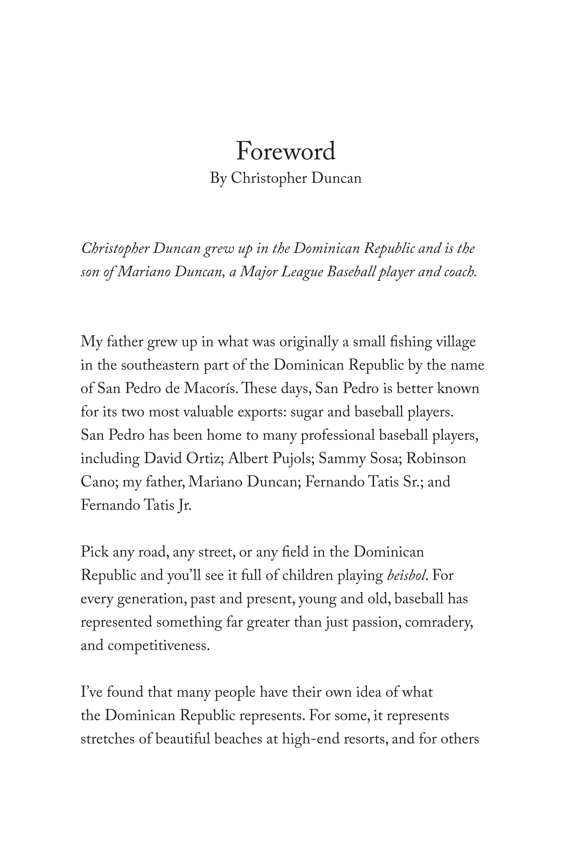 Foreword written by Christopher Duncan, who grew up in the Dominican Republic and is also the son of Mariano Duncan, a Major League Baseball player and coach.