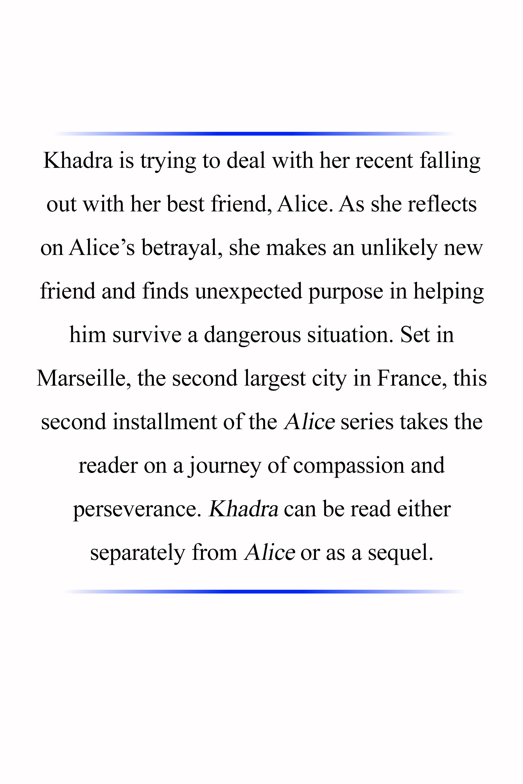 Khadra is trying to deal with her recent falling out with her best friend, Alice. As she reflects on Alice’s betrayal, she makes an unlikely new friend and finds unexpected purpose in helping him survive a dangerous situation. Set in Marseille, the second largest city in France, this second installment of the Alice series takes the reader on a journey of compassion and perseverance. This second installment can be read either separately from Alice or as a sequel.