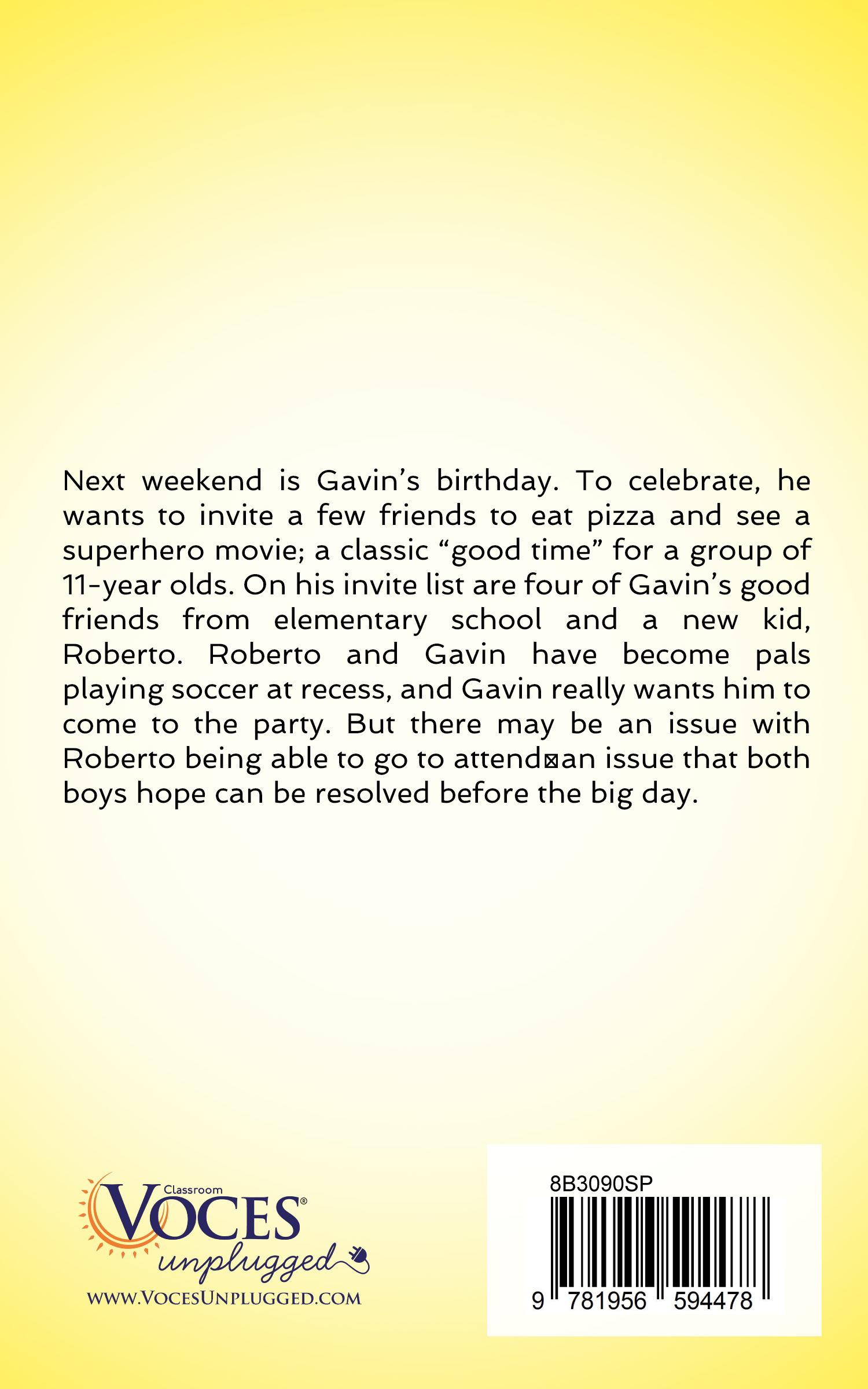Next weekend is Gavin’s birthday. To celebrate, he wants to invite a few friends to eat pizza and see a superhero movie; a classic “good time” for a group of 11-year-olds. On his invite list are four of Gavin’s good friends from elementary school and a new kid, Roberto. Roberto and Gavin have become pals playing soccer at recess, and Gavin really wants him to come to the party. But there may be an issue with Roberto being able to attend…an issue that both boys hope can be resolved before the big day.