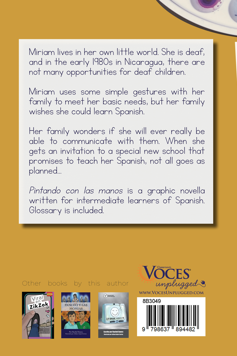 Pintando con las manos is a fully illustrated graphic novella written for intermediate learners of Spanish. Glossary is included.