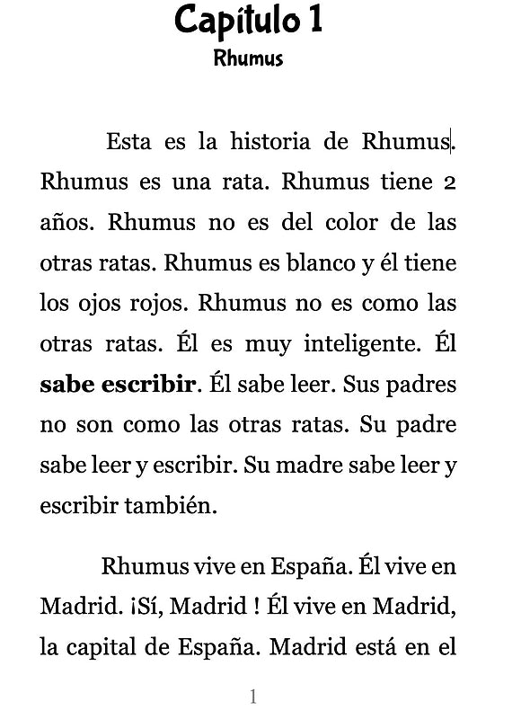 Rhumus is a rat who can read and write. He lives under the streets of Madrid, Spain, with his mom and dad. One day, the rats experience a loud explosion that not only separates Rhumus from his parents but leaves him hard of hearing. How will Rhumus be able to find his parents if he can't hear? Will he venture alone into the streets of Madrid? Can his special talent help him to find his family?